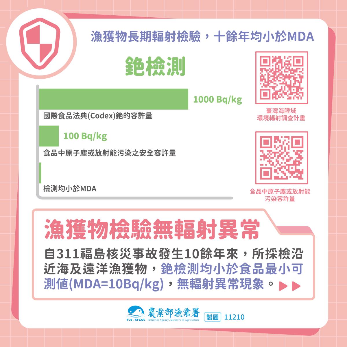 ✅自311福島核災事件後,漁業署定期檢測沿近海及遠洋漁獲物,10餘年來銫檢測值均小於最小可測值(MDA),漁獲物檢驗無輻射異常。