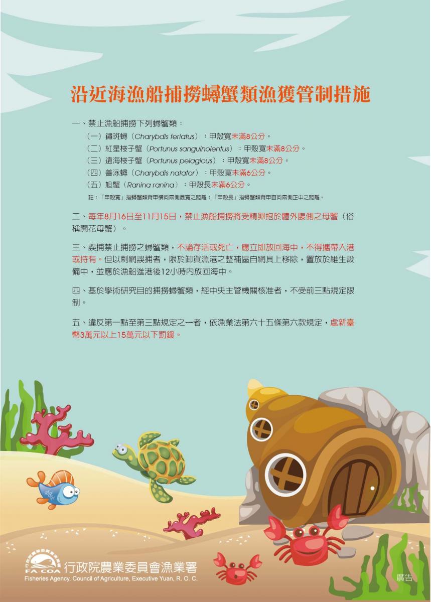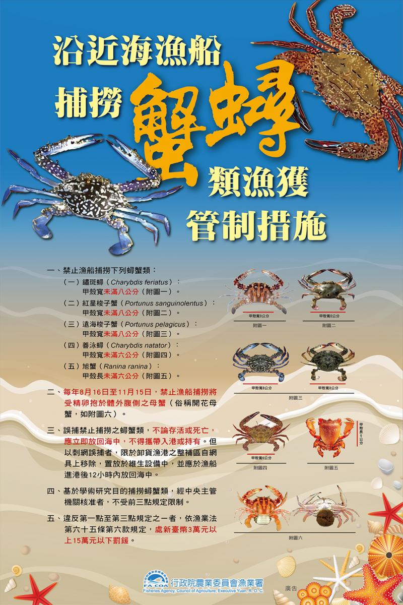 行政院農業委員會為使蟳蟹類資源永續利用,自本(103)年4月1日起實施「沿近海漁船捕撈蟳蟹類漁獲管制措施」,全年禁止採捕甲殼寬未滿8公分之花蟹(鏽斑蟳)、三點仔(紅星梭子蟹)、花市仔(遠海梭子蟹)、甲殼寬未滿6公分之石蟳(善泳蟳),以及甲殼長未滿6公分之蛙形蟹(旭蟹);每年自8月16日至11月15日止,禁止捕撈將受精卵抱於體外腹側之母蟹(開花母蟹)。倘誤捕禁止捕撈之蟳蟹類,不論存活或已死亡,應立即放回海中,不得攜帶入港或持有。請漁民朋友務必配合,以共同維護蟳蟹類資源之永續。