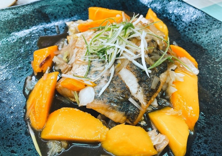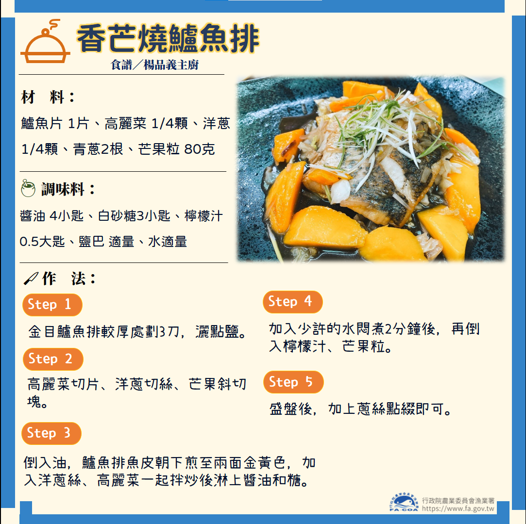 時序進入立夏,天氣漸趨炎熱,此時最適合補充夏日容易流失的蛋白質,金目鱸魚口感細緻,好消化吸收,搭配當季水果,亦能變化出夏日美味清爽的窈窕料理。漁業署特別邀請金牌主廚楊品義設計「香芒燒鱸魚排」,將金目鱸魚片乾煎後,加入洋蔥、高麗菜等蔬果拌炒,佐以夏季聖品芒果擺盤,新鮮的鱸魚肉細軟嫩,搭配清爽的蔬果,嚐起來酸甜香滑,非常適合家人聚餐一起享用。