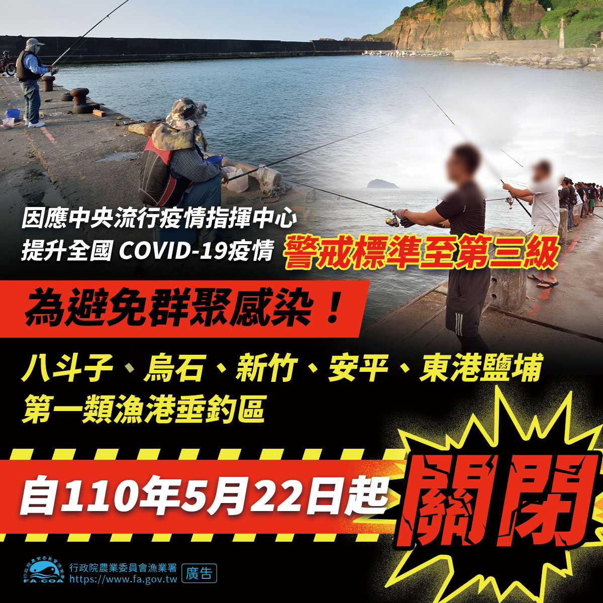 中央流行疫情指揮中心於110年5月19日提升全國COVID-19疫情至第三級警戒,民眾外出時須全程配戴口罩,避免不必要移動、活動或集會,停止室內5人以上、室外10人以上之聚會,營業及公共場域落實戴口罩及維持社交距離。漁業署表示,為防止疫情擴散,避免群聚感染,第一類漁港垂釣區自110年5月22日起關閉,後續視疫情狀況再檢討開放。