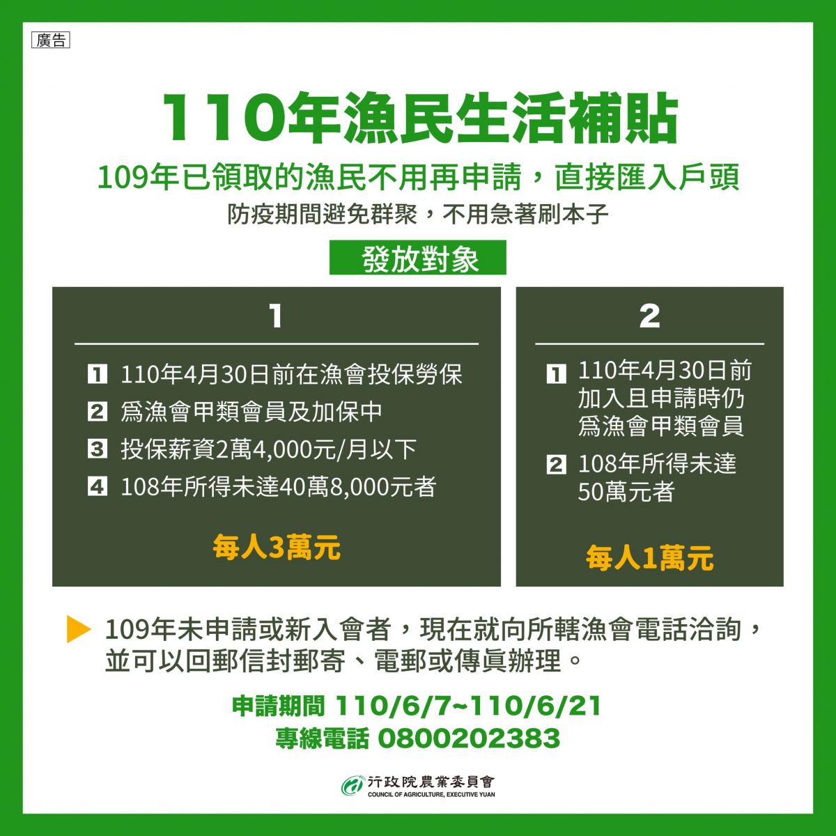 漁業署表示,今年漁民生活補貼金核發資格與去年相同,並基於防疫考量,無需臨櫃申請,採直接審核後匯入漁民帳戶。漁業署說明「無一定雇主或自營作業之漁民生活補貼」3萬元補貼金,核發資格為110年4月30日已為漁會甲類會員並於漁會參加勞工保險,且申請補貼時仍為漁會甲類會員及勞保加保中、110年4月之勞保月投保薪資為2萬4,000元(含)以下、108年個人綜合所得稅各類所得總額未達綜合所得稅課稅標準40萬8,000元;「實際從事漁業勞動之漁民生活補貼」1萬元補貼金,核發資格為110年4月30日已為漁會甲類會員且申請補貼時仍為漁會甲類會員、108年個人綜合所得稅各類所得總額未達50萬元;凡符合者會直接入帳,若漁民朋友有任何疑問,可逕洽漁會洽詢;並提醒漁民防疫期間無需聚在漁會或金融機構於存摺機前刷存簿確認入帳。另漁業署亦感謝合作金庫大力協助撥款事宜,讓逾30萬漁民能在明日起就領得到生活補貼金。