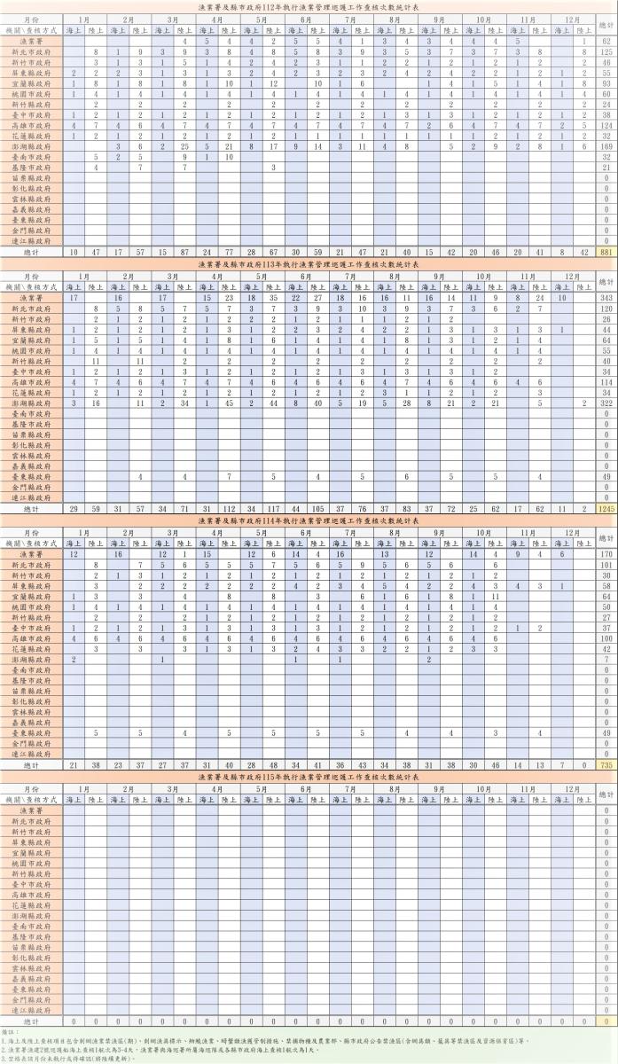 漁業署及縣市政府執行漁業管理巡護工作查核次數統計表