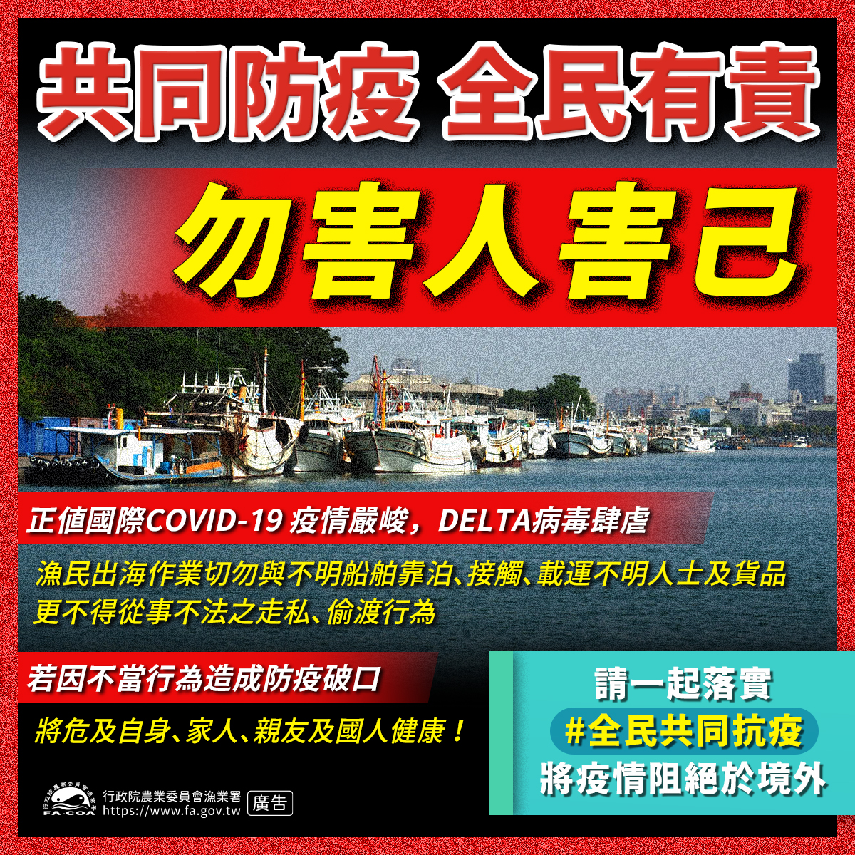 漁業署再次強調,國際COVID-19 疫情嚴峻,DELTA病毒肆虐,全體國人應上下一體、齊心抗疫,請漁船船主及船長於海上作業時,切勿與不明船舶靠泊、接觸、載運不明人士及貨品,亦不得從事不法之走私、偷渡行為,落實全民共同抗疫,將疫情阻絕於境外。