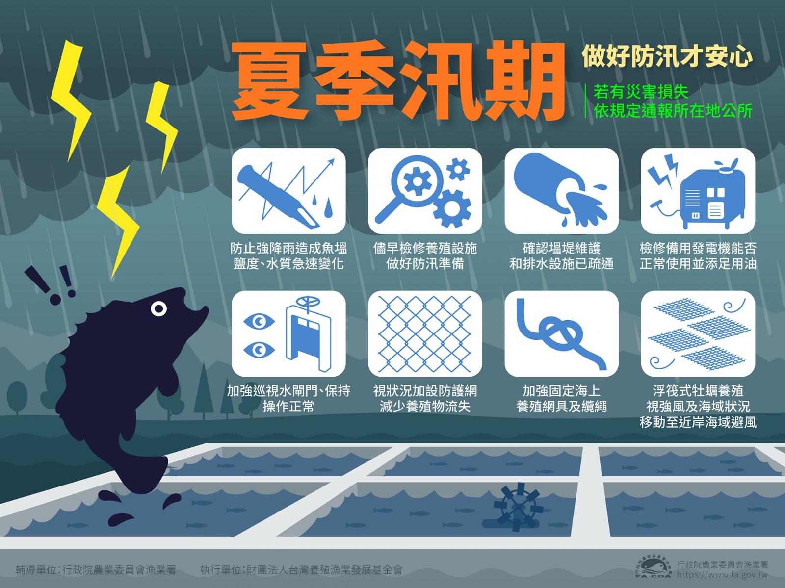 箱網及淺海牡蠣養殖業者,請加強固定海上網具及纜繩等設施。請在低窪地區之養殖漁民,落實魚塭岸壁鞏固與排水設施疏通及加強巡視水閘門、養殖備用水源整備,及檢修備用發電機正常運作並添足用油;必要時請於塭堤加設防護網,及作好短時間強降雨造成魚塭鹽度、水質急速變化影響養殖物的因應措施。