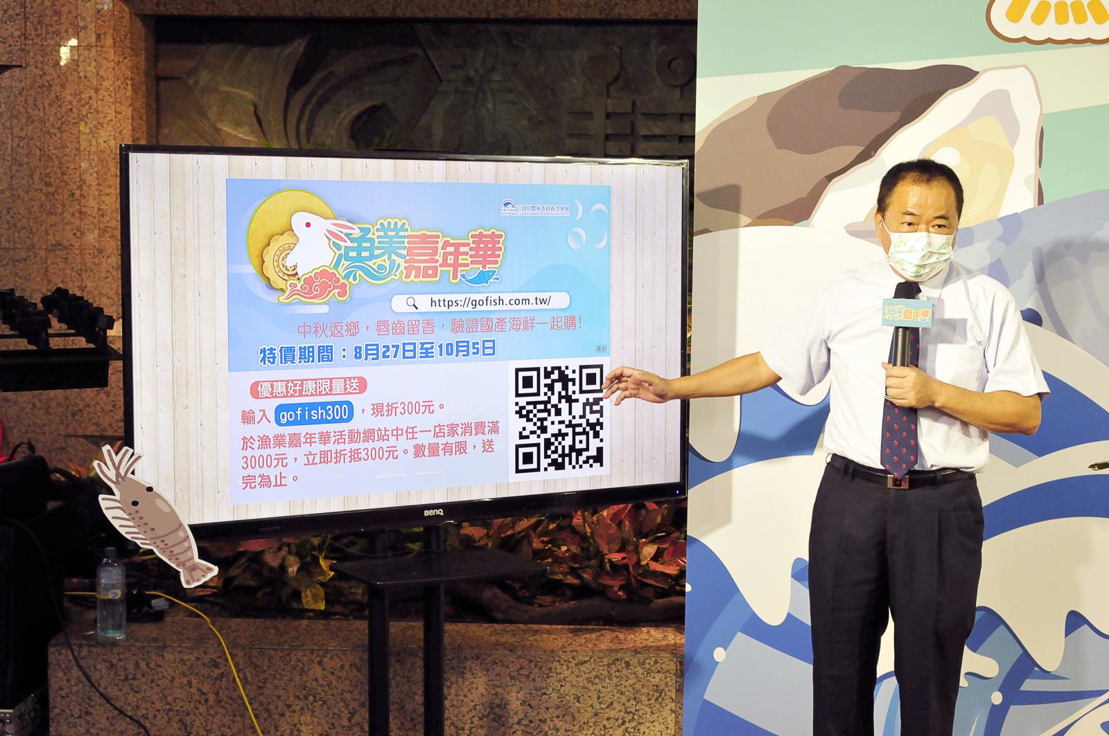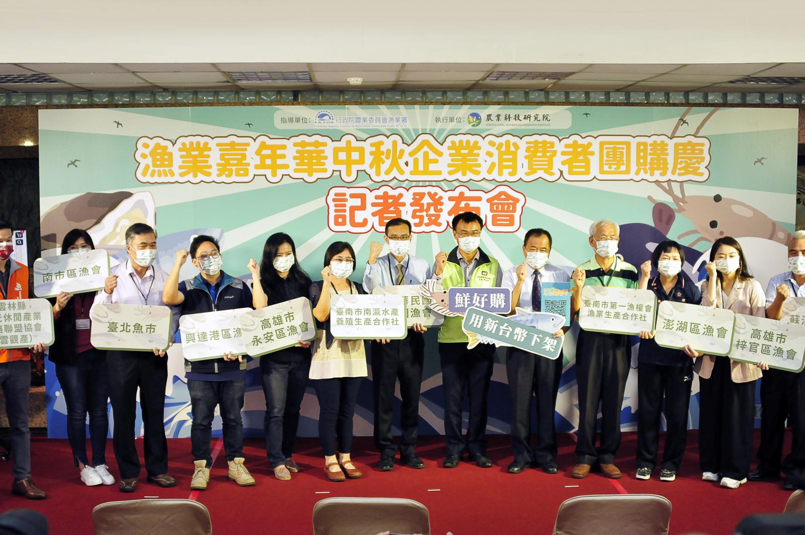 中秋佳節將至,漁業署今日舉辦漁業嘉年華中秋企業消費者團購慶記者會,行政院農業委員會主任委員陳吉仲、漁業署署長張致盛、中華民國全國漁會總幹事林啟滄等各產業團體代表連袂出席,並在記者會上向國人推薦當令國產水產品,鼓勵消費者多採用優質的國產水產品作為中秋燒烤的食材,讓中秋節吃的健康、清爽、少負擔;同時,為滿足消費者及公司行號中秋送禮的需求,漁業署委託財團法人農業科技研究院(以下簡稱農科院)推出漁業嘉年華X中秋海鮮饗宴網購平臺(https://gofish01.waca.tw/),自即日起至10月5日止,於平臺購買國產水產品組合,消費滿3,000元,輸入折扣碼,可立即折抵300元(折扣碼:gofish300,需購買同一店家產品,數量有限,送完為止),本次活動計有21家業者、72項產品,不限金額,全站免運費,歡迎國人踴躍購買。