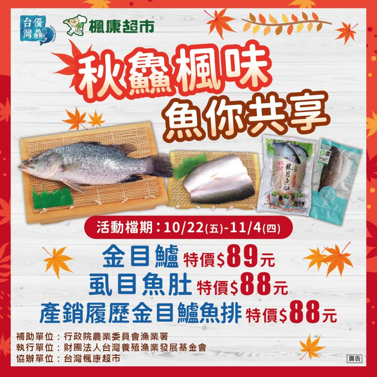 漁業署表示,與楓康超市合作多年,一系列水產品促銷活動屢獲好評,今年年末再度攜手,壓軸推出「秋鱻風味 魚你共享」活動,推廣當令的龍虎斑、虱目魚、金目鱸等水產品。