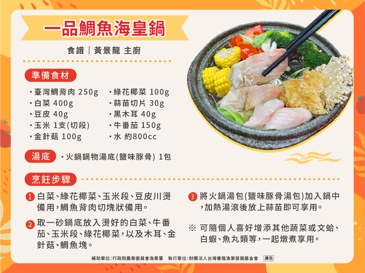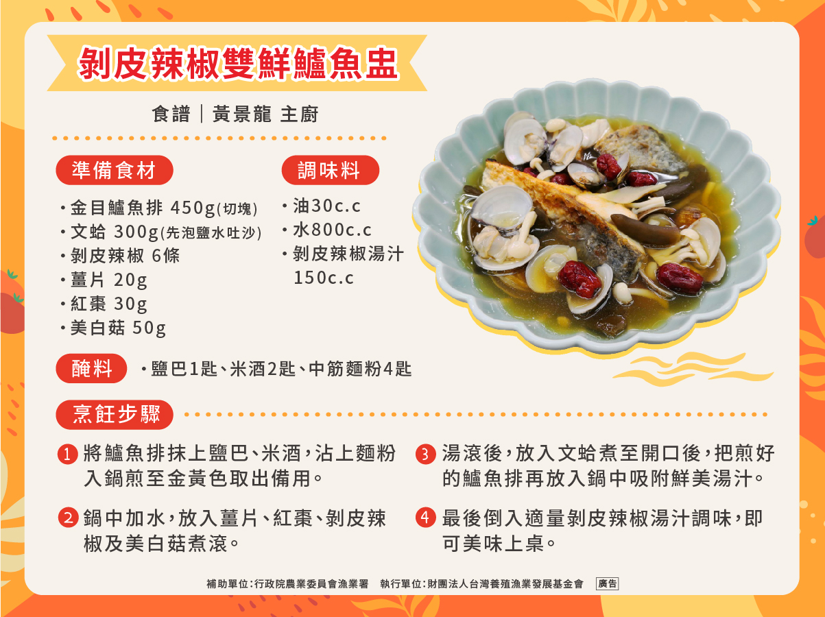 本次「秋食海鮮季」活動特別邀請金牌主廚─黃景龍(龍師傅),選用去刺去骨分切包裝好的冷凍真空「金目鱸魚排」,以及全聯獨家濕式熟成技術的「熟成無刺虱目魚肚」、「臺灣鯛背肉」等貼體包產品,設計出三道美味料理食譜。包括有:金目鱸魚排搭配文蛤,加入時下流行的剝皮辣椒,煮成既暖心又暖胃的「剝皮辣椒雙鮮鱸魚盅」;家常用魚搭著溫補藥膳食材,就能煮出好滋味的「藥膳滋補虱目魚湯」;以及搭配湯底加上當令時蔬,就能全家同享的團圓鍋物「一品鯛魚海皇鍋」等多樣料理,只需在家簡單烹調,就能品嚐到增添健康防護力的國產水產品料理。