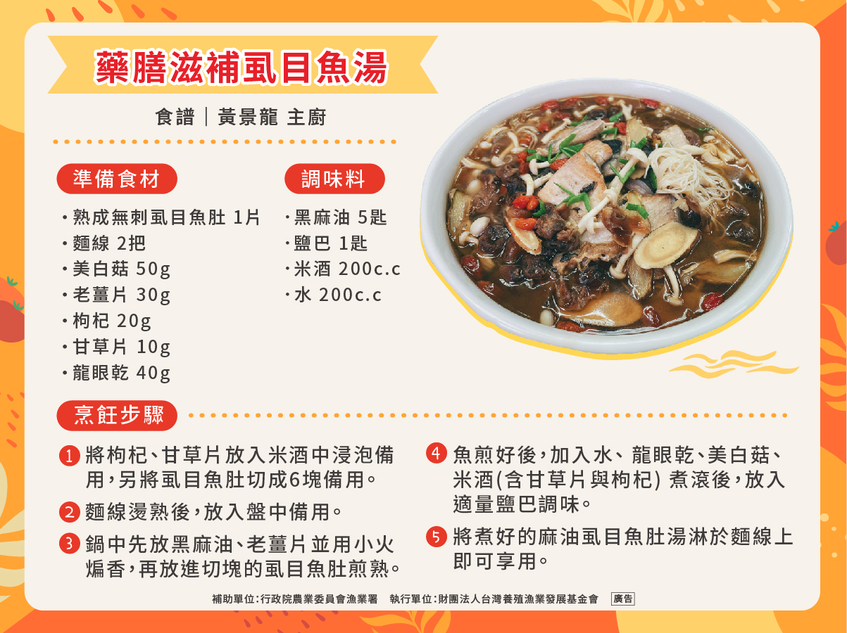 黃景龍師傅表示,使用在地養殖、當令新鮮美味的水產食材,只要簡單調味即可補充優質蛋白質,另外,搭配當令時蔬及溫補中藥材一同烹調,更能達到食補養生與美味享受相輔相成的效果。