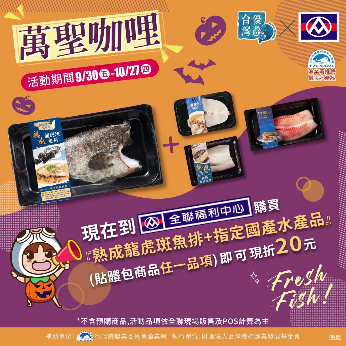 漁業署最後表示,為方便民眾以實惠價格品嚐到當季優質的國產水產品,特別結合全聯福利中心萬聖節檔期推廣國產好魚,消費者至全臺全聯門市選購國產水產品貼體包裝商品(熟成無刺虱目魚肚、港式醬燒無刺虱目魚肚、熟成臺南學甲虱目魚柳、臺灣鯛背肉、鯛魚火鍋片、熟成鮮腹肉、熟成草魚切片等),搭配熟成龍虎斑魚排乙盒,即可享結帳金額現折20元。冷熱交替之際,消費者可選購臺灣鯛魚片用於煮湯、清蒸或是火鍋皆相當鮮美,或是有「牛奶魚」之稱的虱目魚肚、魚柳,以及肉質細緻易消化的草魚等食材,皆是當季最鮮美的水產鮮味。本次檔期全系列商品均提供適合小家庭料理的小包裝規格,方便消費者買回家即能輕鬆享用在地鮮食美味,歡迎喜愛水產品的國人一起來「吃當令,饗在地」,選購安心有保障的臺灣優質水產品。