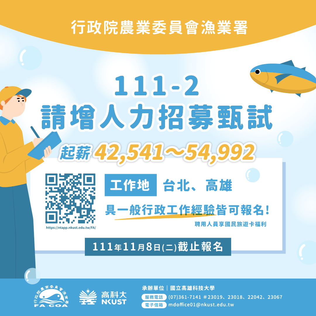 漁業署為辦理「漁業與人權行動計畫」提升漁船勞動檢查量能,確保外籍船員人權之相關規範得以落實與改善,及辦理港口卸魚檢查、執行與管理漁業監控中心等事務,目前尚有13名員額職缺,薪資每月自4萬2,500元至5萬4,000元起,將舉行徵才考試,報名期間自111年10月21日至11月8日,第一試筆試日期為11月27日,分別於臺北及高雄2個考區同時舉辦,歡迎有志從事前述漁業相關事務者踴躍報考。