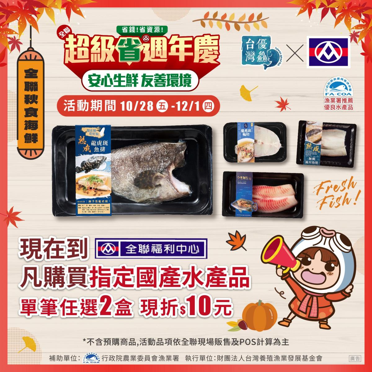 漁業署最後表示,現今民眾保健養生意識抬頭,食補養生需求大增,鼓勵民眾多多食用富含優質蛋白質、DHA、EPA、維生素、礦物質等關鍵營養成分的水產品。迎來秋冬水產豐收的好時節,本次活動再度與全聯福利中心合作,推廣國產水產品,即日起至12月1日期間,消費者至全臺全聯門市選購指定國產水產品任2件(龍虎斑輪切、鯛魚火鍋片、臺灣鯛背肉、生態養殖無刺虱目魚肚、金目鱸魚排、熟成龍虎斑魚排、熟成鮮腹肉、熟成無刺虱目魚肚、熟成臺南學甲虱目魚柳、港式醬燒無刺虱目魚肚等),即享結帳金額現折10元的好康優惠,歡迎民眾把握機會選購,支持在地安心的臺灣水產。