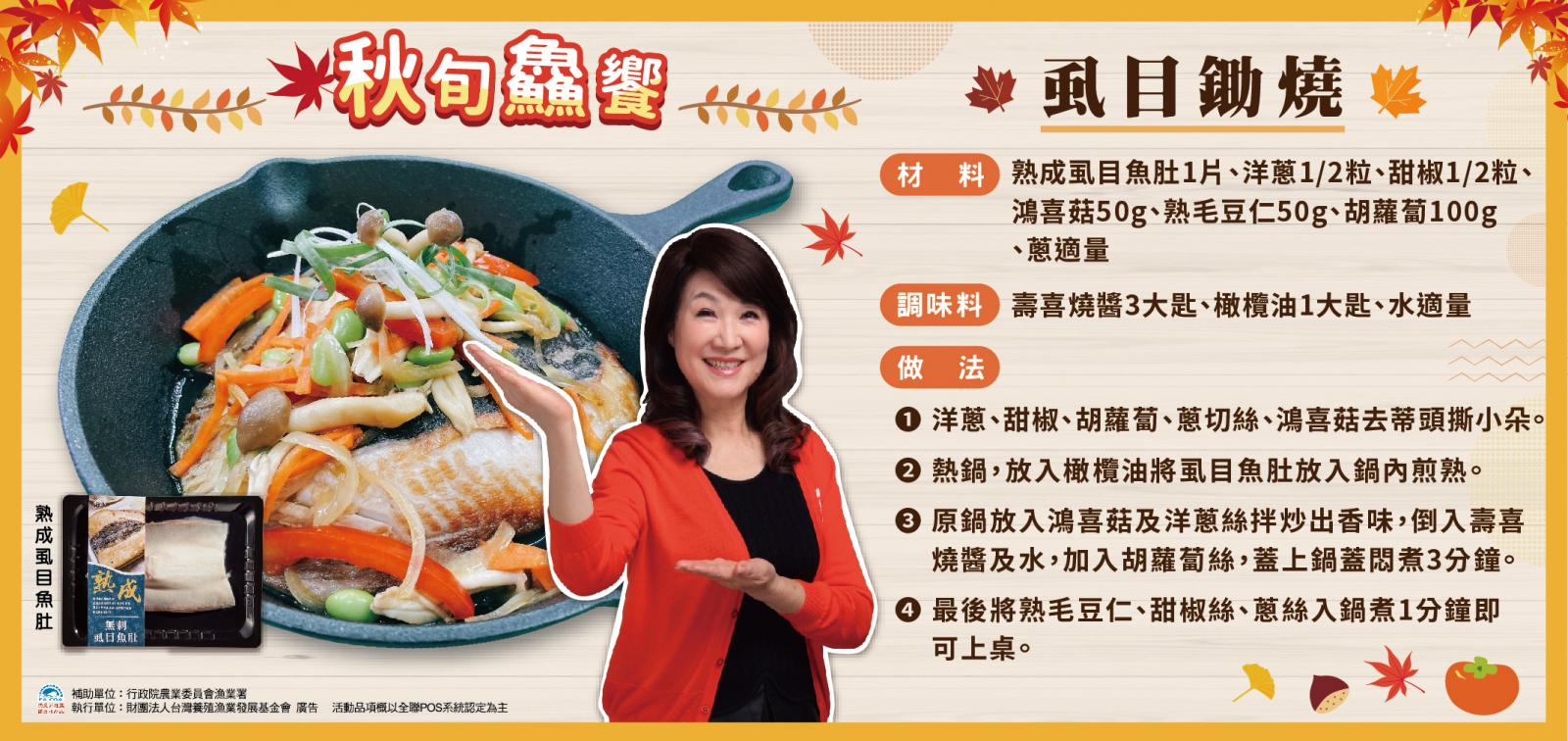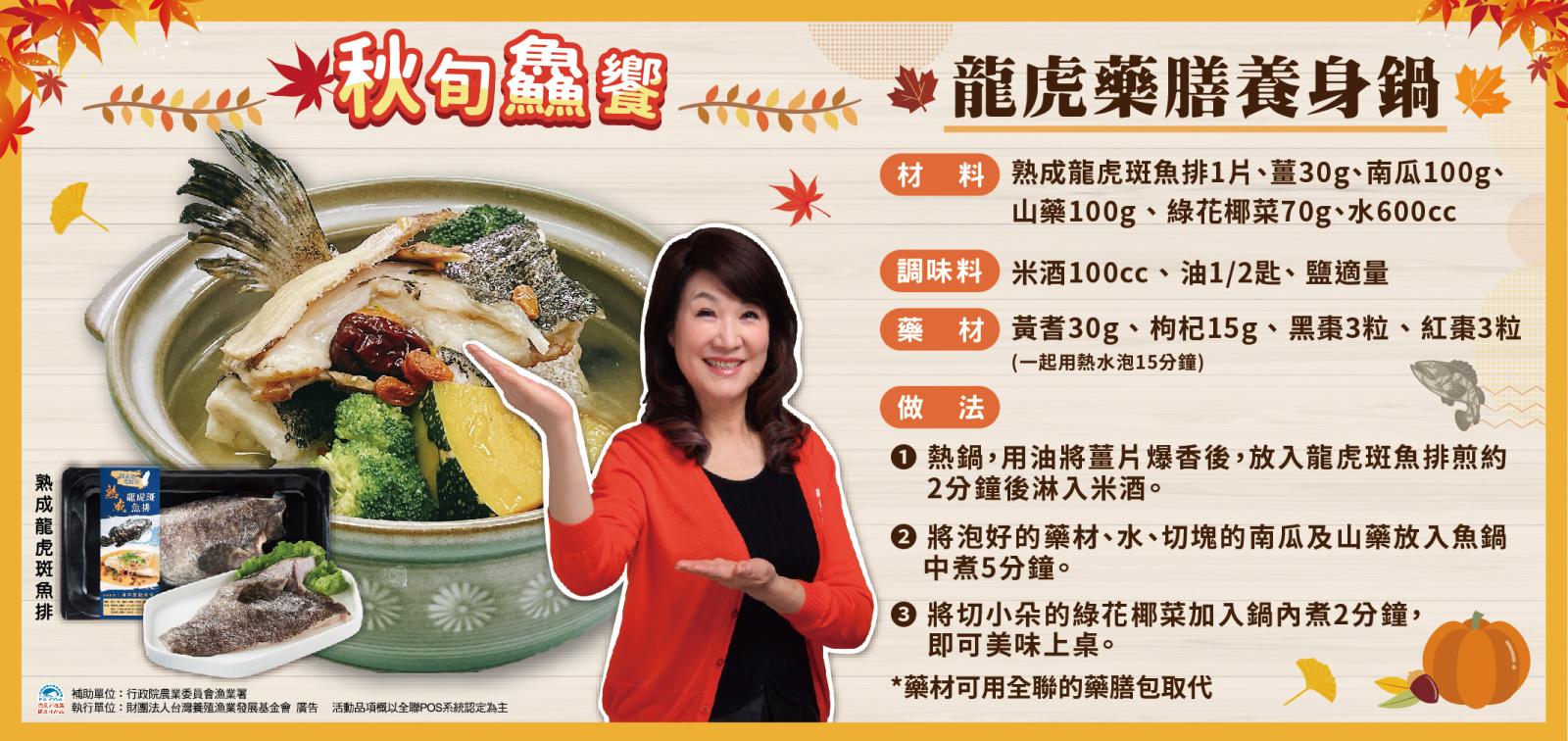 國內藥膳養生料理專家─秋香老師表示,秋冬的漁獲因為儲存了準備過冬的油脂,所以比較肥美,這個時節,非常適合用味道鮮美且蛋白質含量豐富的國產水產品來作為家常的養生食材,像是鱸魚、臺灣鯛、龍虎斑、虱目魚等,都是很好的食補材料。透過簡單的藥膳燉煮或是麻油烹調的方式,加入季節時蔬一起煨煮,兼顧營養均衡與養生保健,適合各年齡層食用。