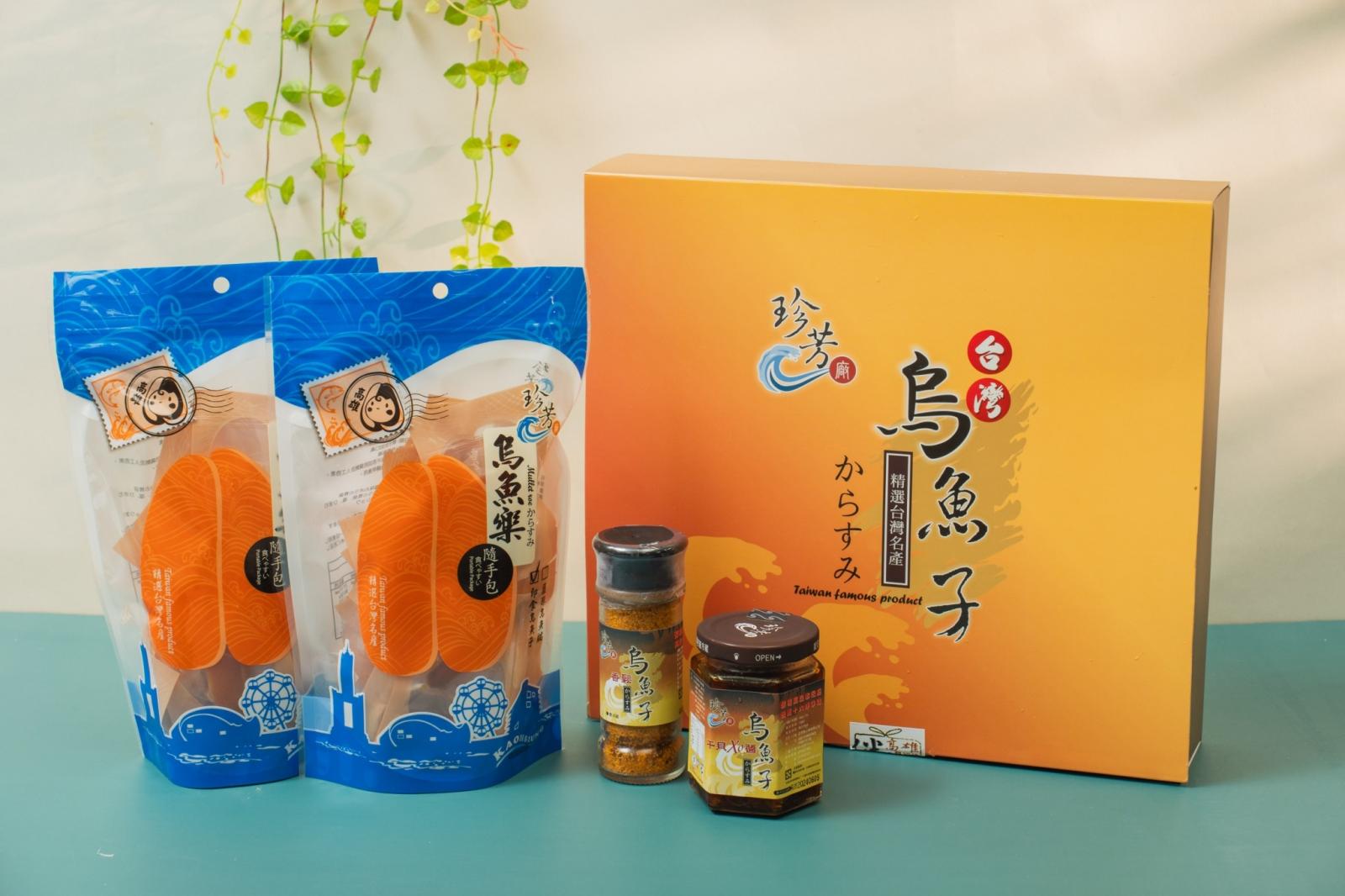 禮盒內含開封即食的烏魚子、烏魚子香鬆及烏魚子干貝XO醬,多元的產品可運用於各式料理。禮盒的包裝以金色及海浪圖騰來傳遞大海的饋贈,搭配書法字體吸引漢學愛好者的目光,拓展海外市場;一次購足珍芳烏魚子最具特色的三種商品,送禮自用兩相宜。
