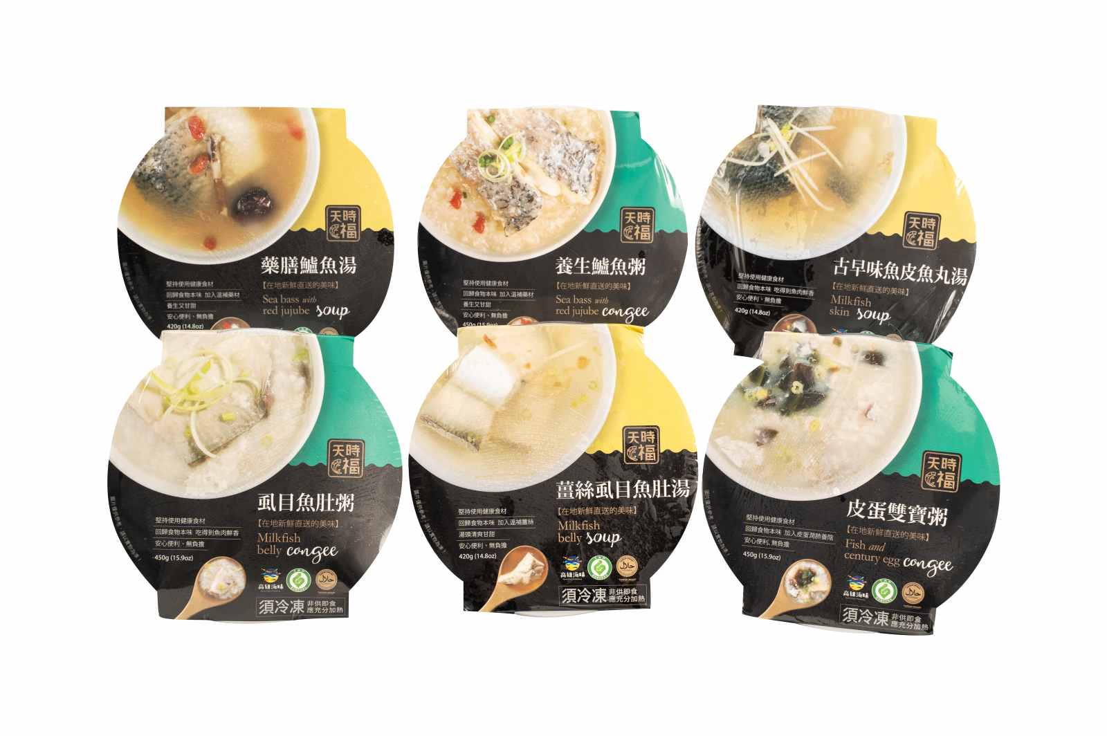 粥品:養生鱸魚粥、虱目魚肚粥、皮蛋雙寶粥;湯品:養生鱸魚湯、薑絲虱目魚肚湯、古早味魚皮魚丸湯(共6種口味可供選擇)。採用100%國產產銷履歷的魚與產銷履歷的米,加上簡單的調味,沒有過多的烹煮和任何化學添加物,為的就是呈現出食材的本味,吃得健康與安心。只要簡單的復熱(隔水加熱或微波),非常方便迅速,適合現在忙碌的上班族,是正餐也是宵夜的最佳選擇。