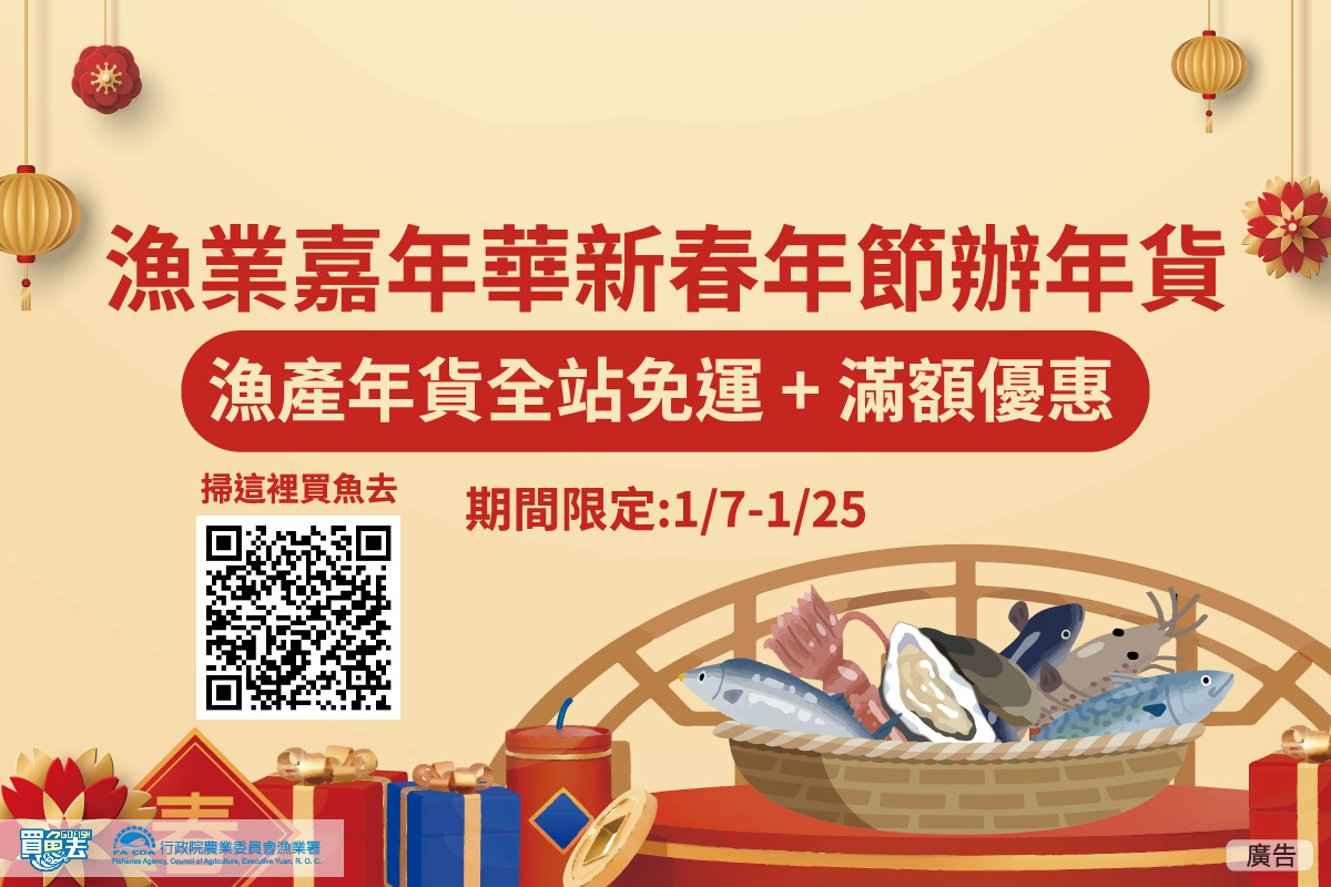 農曆春節將至,親朋好友相聚圍爐吃年夜飯為國人重要習俗之一,而象徵「年年有餘」的魚料理更是年夜飯當中不可缺少的。漁業署為滿足民眾年節料理及過年送禮的需求,號召18家產業團體推出漁業嘉年華─新春年節辦年貨網購活動,有超過70組生鮮漁產品組合及海味零嘴,更首次推出加熱即食海味年菜,讓民眾「吃好魚、過好年」。
