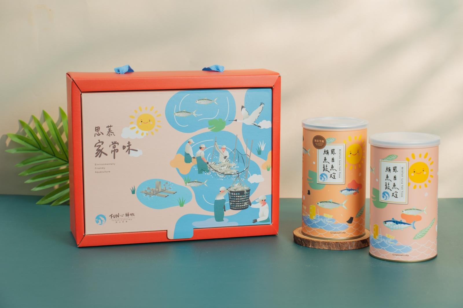 由百大青農夫妻檔,秉持著生態永續、友善養殖、精準投餵、產銷溯源、全魚加工的理念,嚴選布袋虱目魚加上黃鰭鮪魚肉,依黃金比例焙炒至最佳口感,甘甜美味,是餐桌上好夥伴。包裝盒上直接製作提把,並以可愛的手繪插圖呈現虱目魚的生產環境,推廣食魚教育的同時也減少過度包裝,為環保永續盡一份心力。