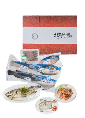 嚴選臺南養殖產銷履歷白蝦、午仔魚、永安養殖石斑魚、臺灣漁船所捕獲之?魠魚、白鯧、軟絲。本水產品經過急速冷凍、真空包裝的方式處理,鎖住原始的鮮甜美味。包裝以玄海御饌-水產頂級饗宴為主題,象徵來自海洋的珍貴禮物,送禮大方得宜。