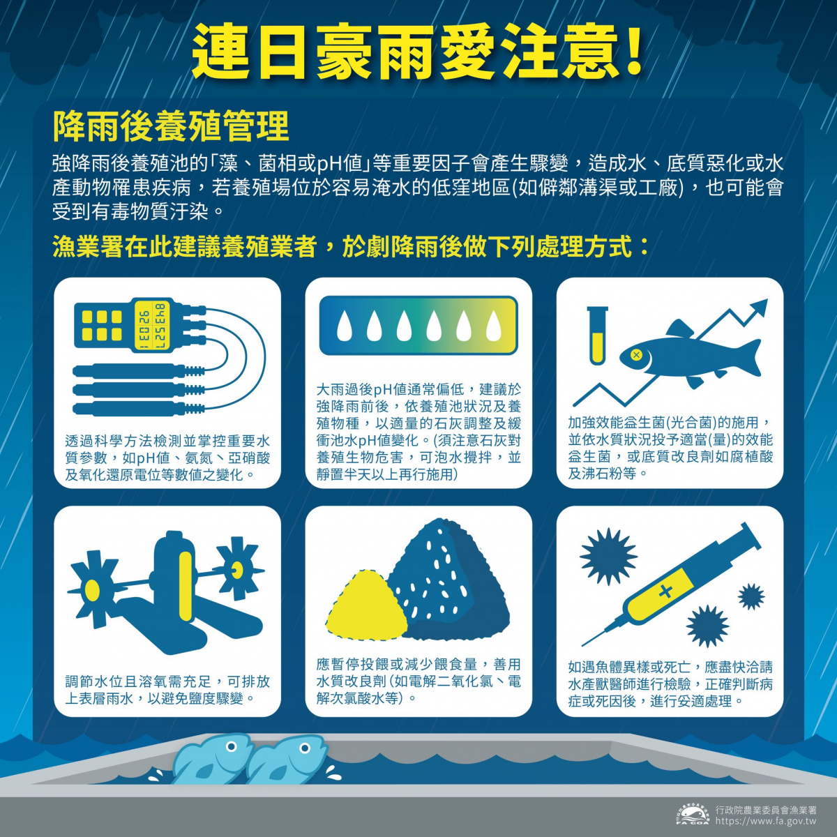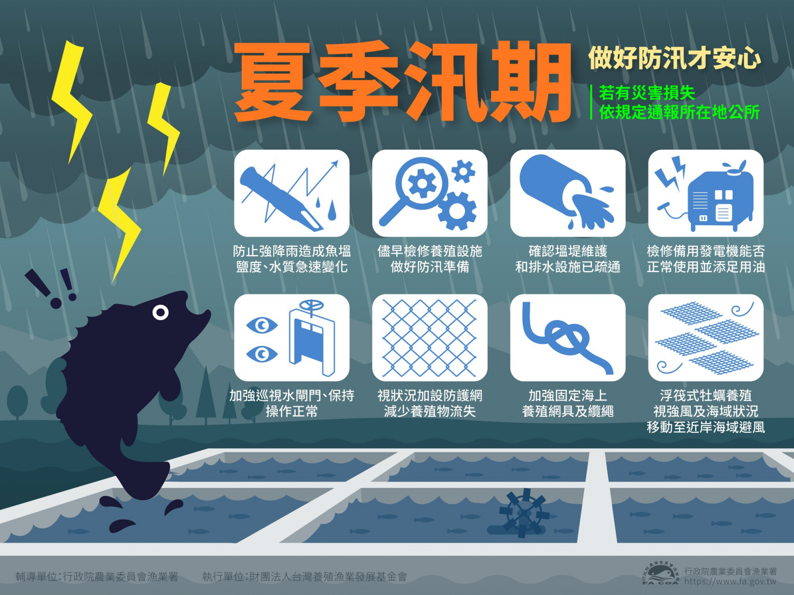 漁業署再次呼籲,汛期期間,應確實加強魚塭排水及管理措施,作業期間請注意瞬間大雨、雷擊、強陣風及溪水暴漲,低窪地區請慎防淹水,並注意人身安全。