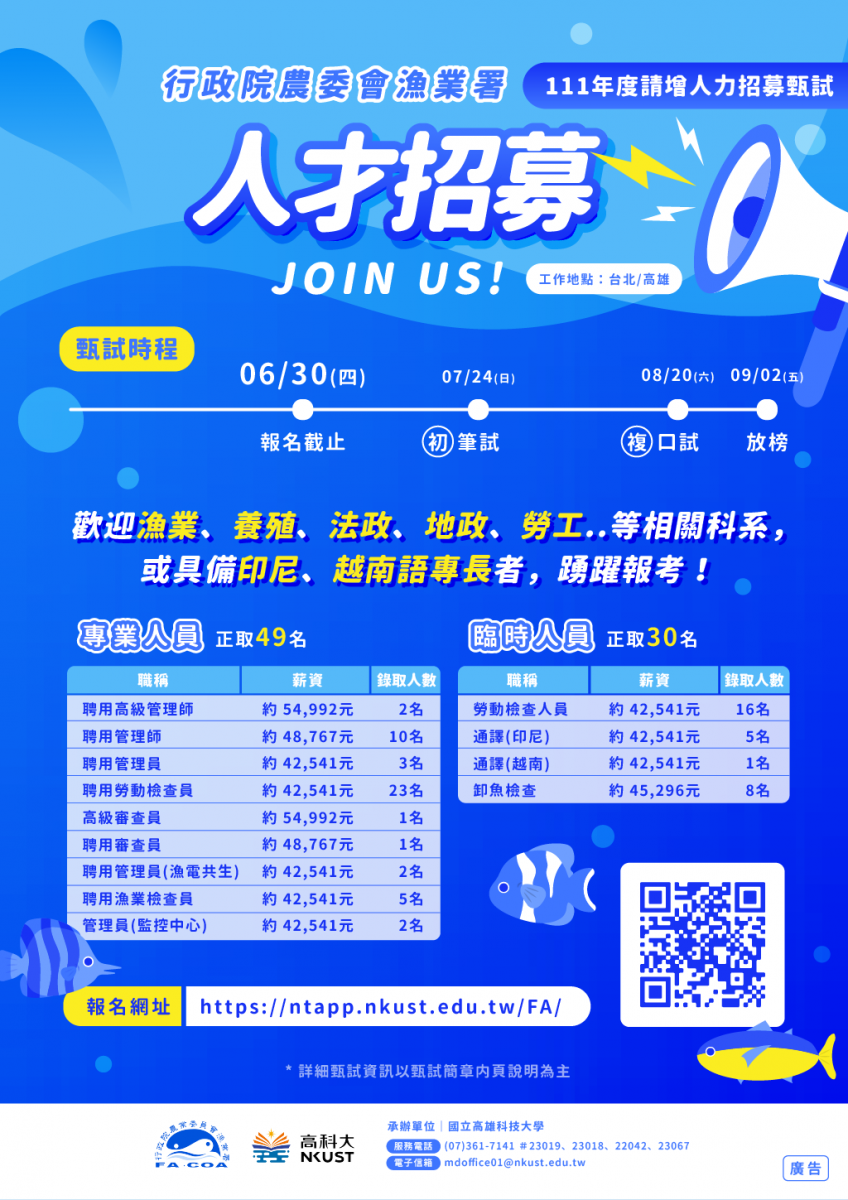 漁業署為辦理「漁業與人權行動計畫」提升漁船勞動檢查量能,確保外籍船員人權之相關規範得以落實與改善,及辦理港口卸魚檢查、公海登檢、推動漁電共生政策、執行與管理漁業監控中心等事務,招募聘用人員49名及臨時人員30名,共計79名人員,薪資為4萬2,500元起。報名期間自6月1日至6月30日,第一試筆試日期為7月24日,分別於臺北及高雄2個考區同時舉辦,歡迎有志從事前述漁業相關事務者踴躍報考。