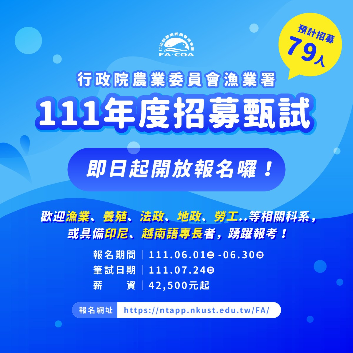 漁業署招考漁業勞動檢查等人員共計79人,歡迎有意者踴躍報考