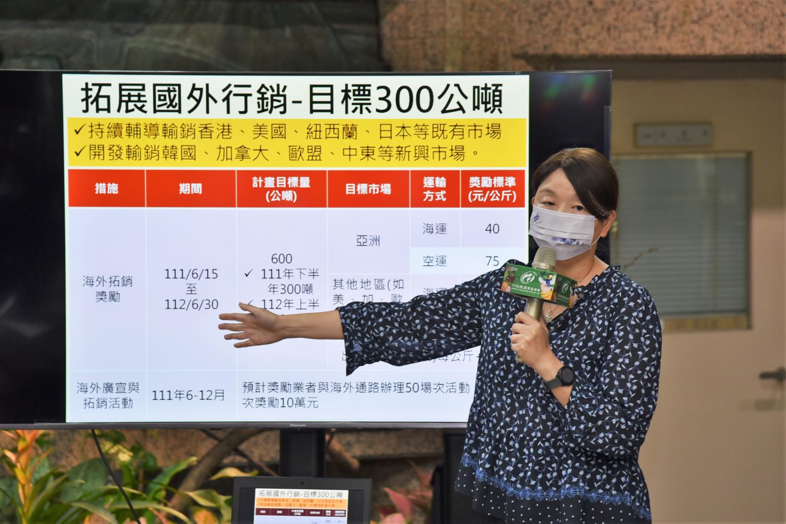 海外拓銷部分,持續輔導業者深耕香港、美國、紐西蘭、日本等既有市場,並開發韓國、加拿大、歐盟、中東等新興市場,提出「海外拓銷獎勵」及「海外廣宣與拓銷活動」等兩措施。其中「海外拓銷獎勵」針對不同國家及航運方式,給予拓銷獎勵金每公斤40元到90元,另針對魚片及輪切等產品,每公斤再加碼10元獎勵;此外,農委會將與外貿協會合作,輔導業者與海外通路如百貨、超市、賣場、餐飲通路等舉辦廣宣與拓銷活動,向國外消費者介紹我國優質石斑魚。