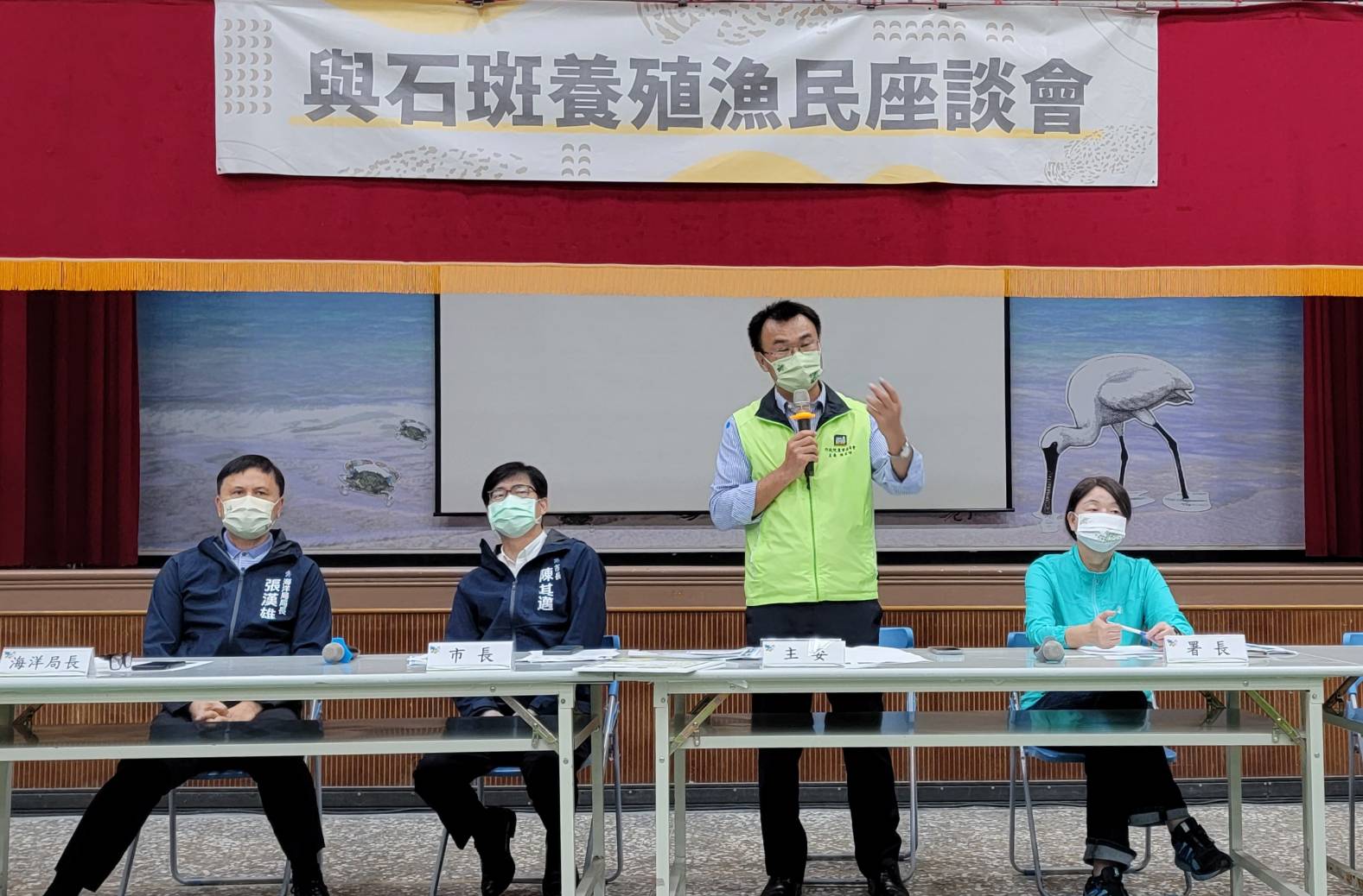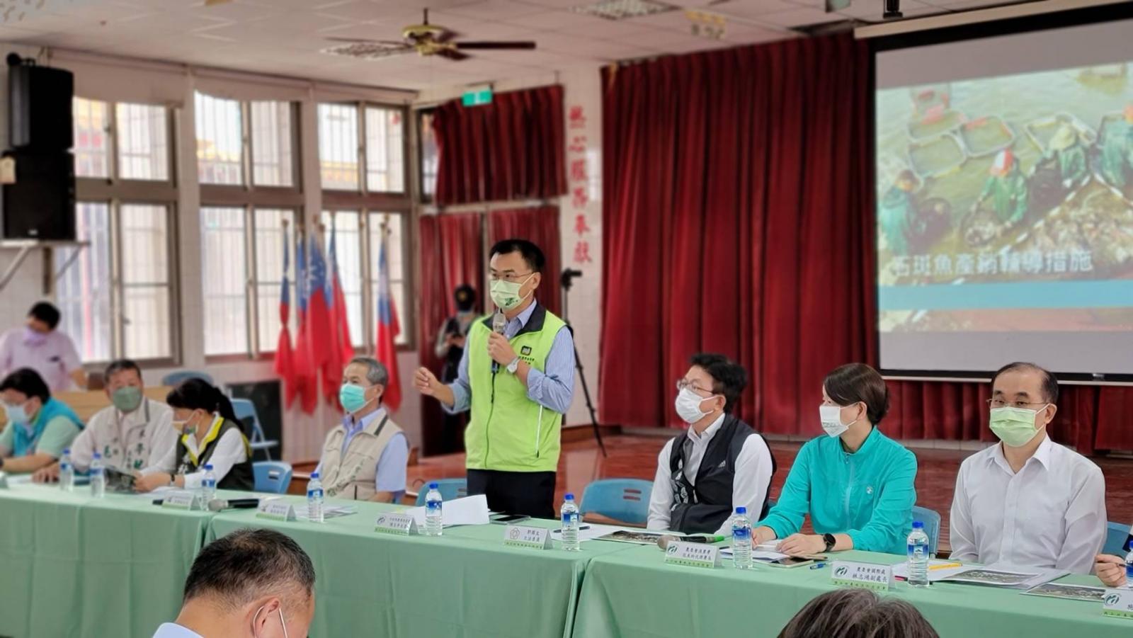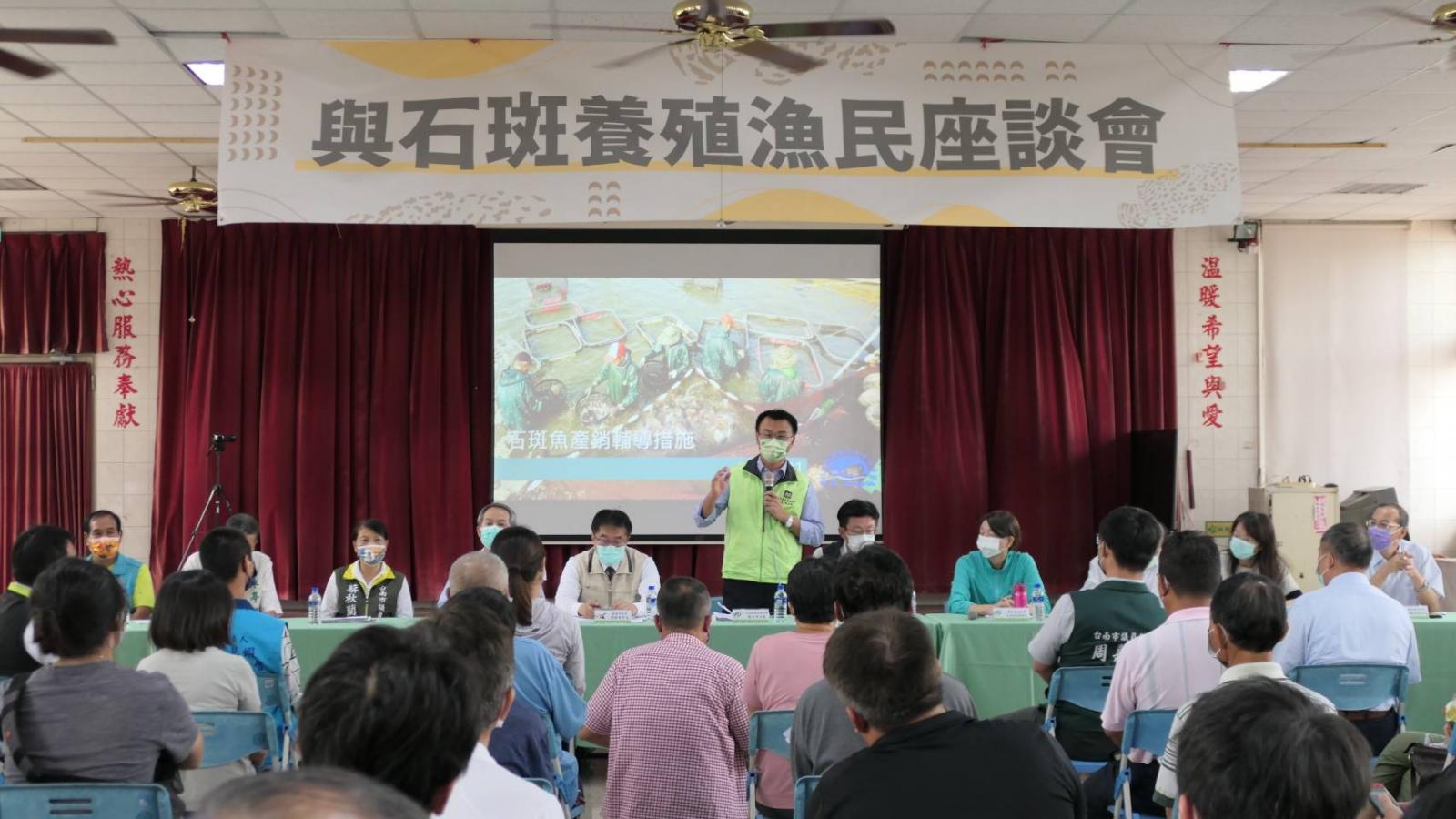 行政院農業委員會主任委員陳吉仲今(1)日率隊前往臺南市七股區中寮社區活動中心及高雄市永安區中正堂,與臺南市長黃偉哲及高雄市長陳其邁共同與石斑養殖漁民座談,傾聽在地漁民朋友心聲,進行雙向溝通交流,並現場引介加工、通路業者,氣氛熱絡。