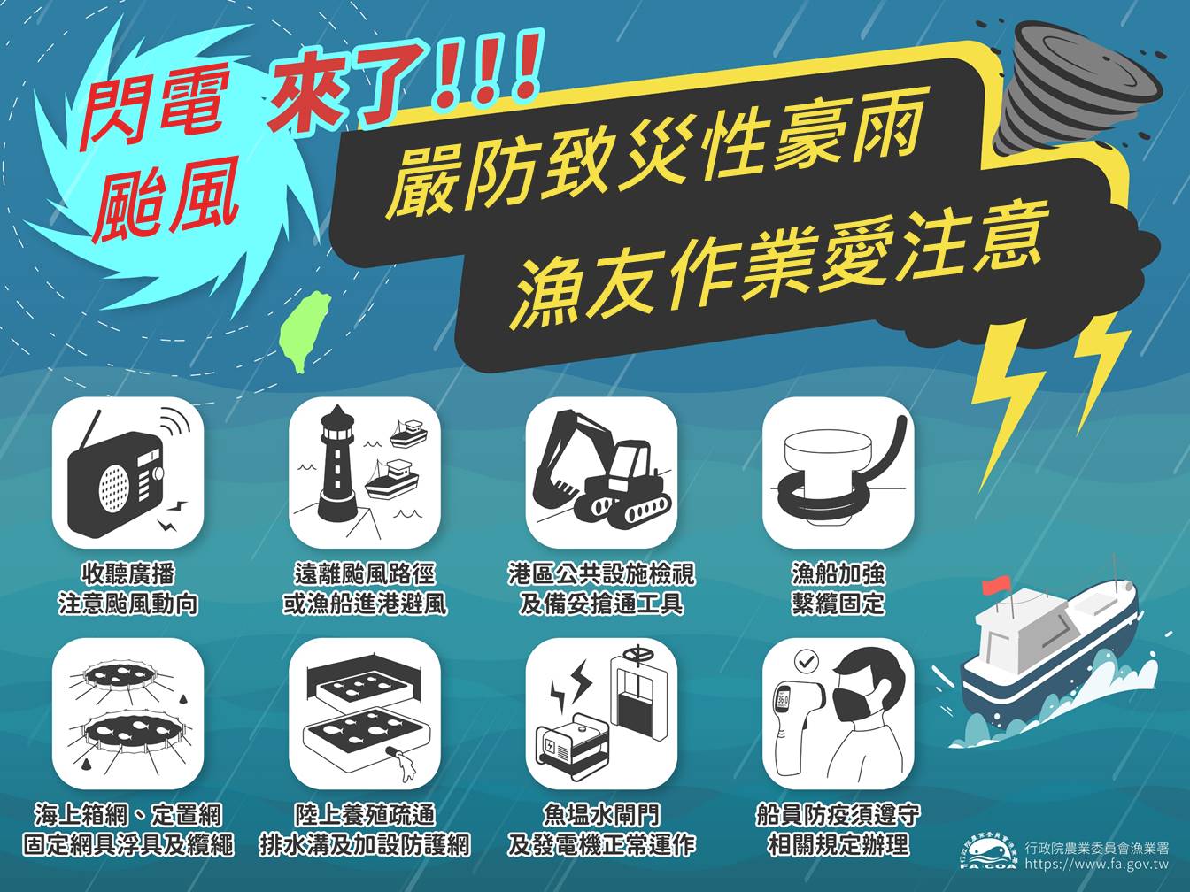 請養殖業者確實鞏固魚塭岸壁與疏通排水設施,並加強巡視水閘門、養殖備用水源,另請檢修備用發電機正常運作並添足用油;必要時請於塭堤加設防護網,及作好短時間強降雨造成魚塭鹽度、水質急速變化影響養殖物的因應措施。加強漁港設施及在港漁船防颱作為